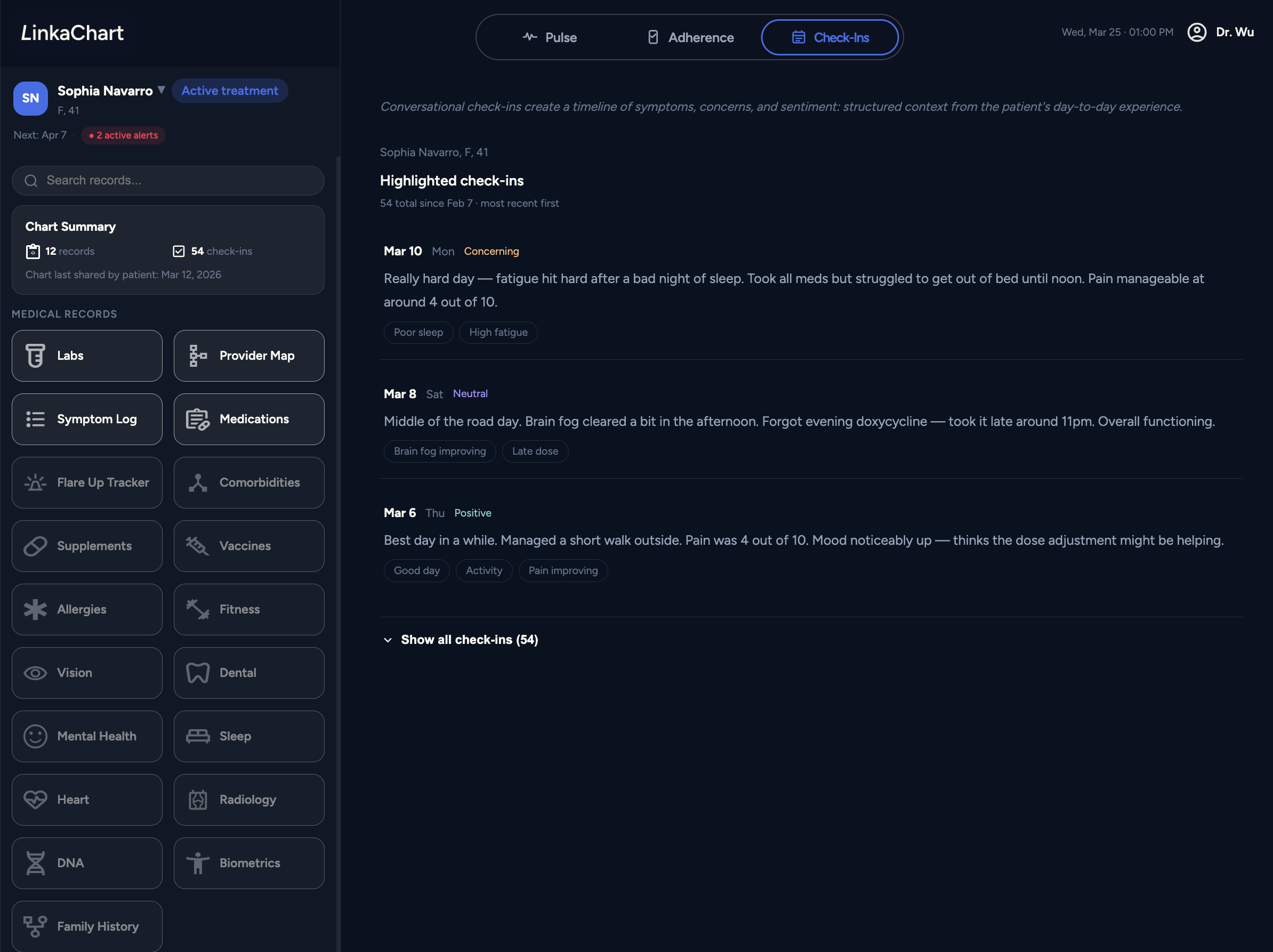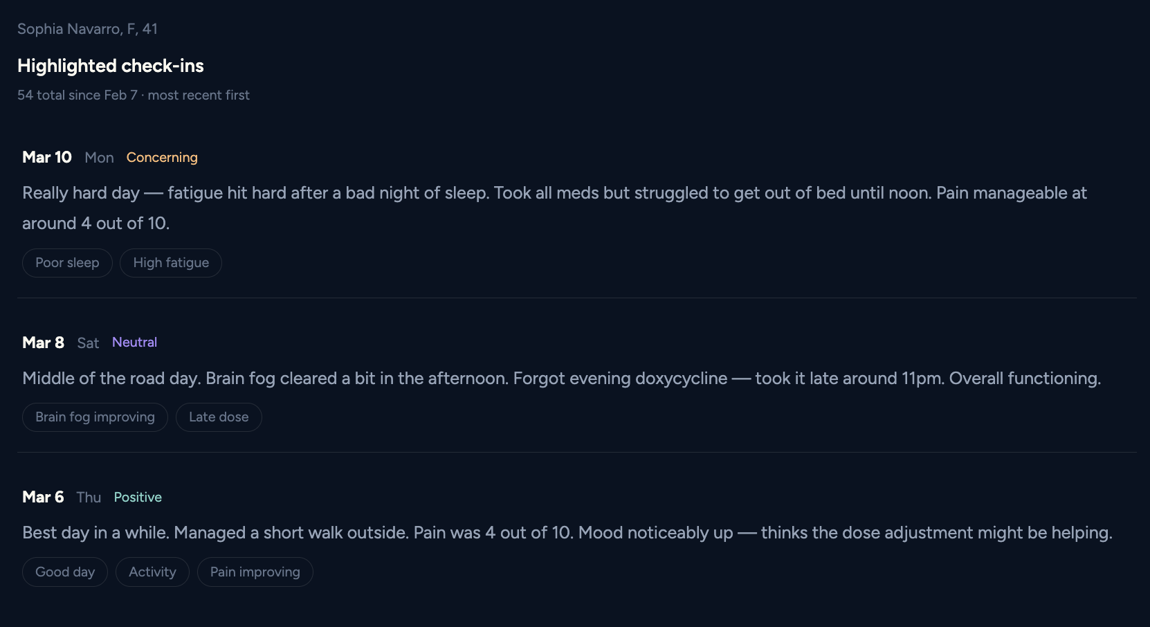 Conversational check-ins create a timeline of symptoms, concerns, and sentiment, helping you quickly see how things have been going since the last appointment.