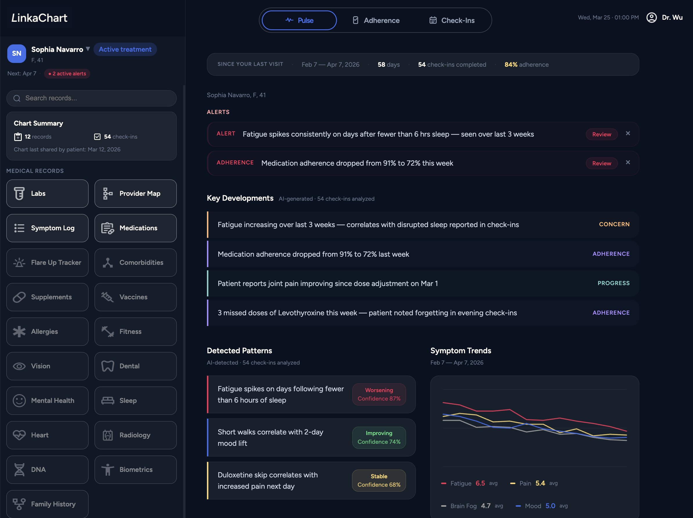 Most tools only capture the appointment. LinkaChart helps you understand what happens in between. Patients log symptoms, organize records, and stay on top of follow-ups, and the Clinician Portal turns that continuous context into structured intelligence for the care team.