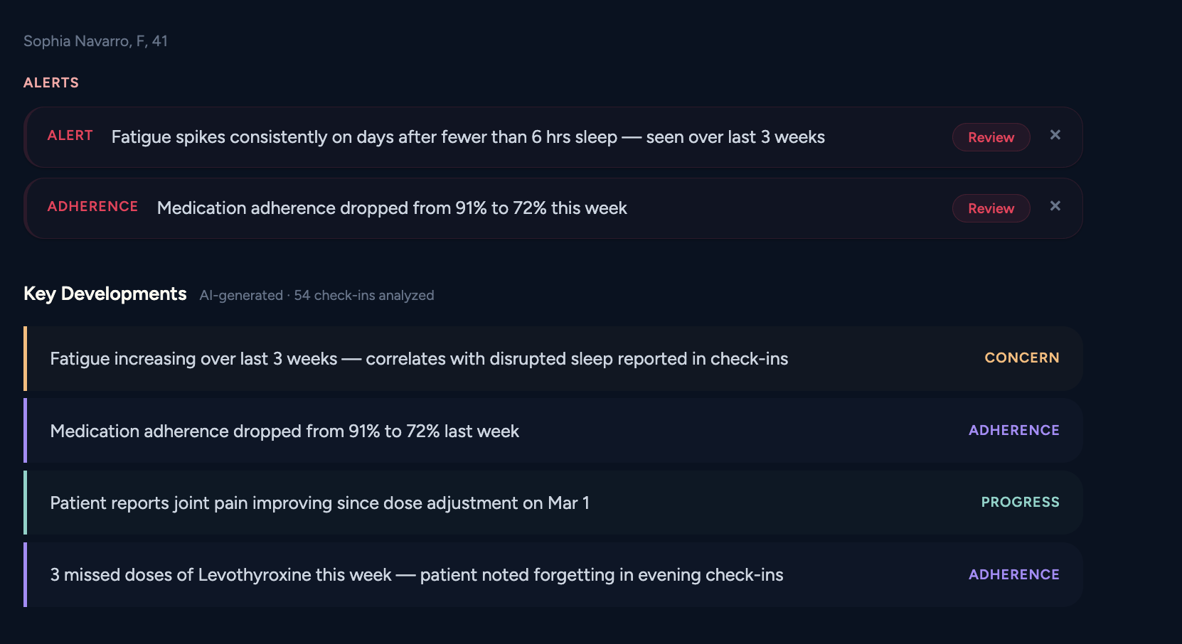 Get a concise progress report that brings together records, symptoms, adherence, check-ins, and meaningful patterns into one clinical snapshot, helping you quickly see what changed, what needs attention, and what to focus on next.